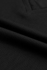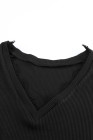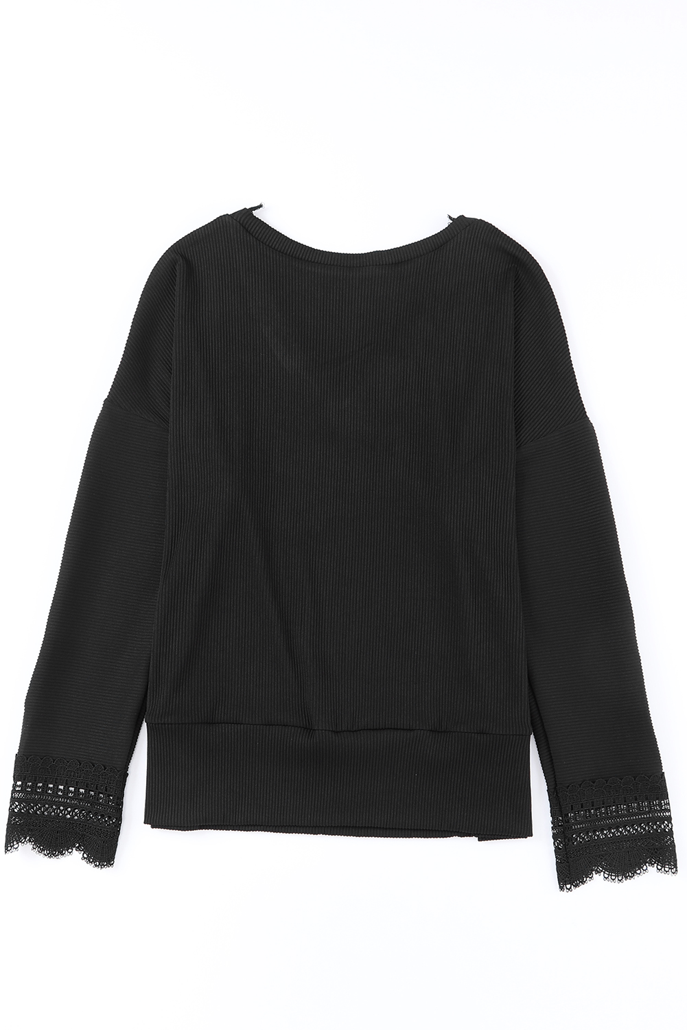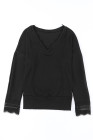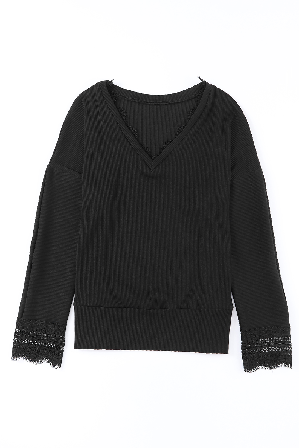 Schwarzes, langärmliges Top mit gerippter Struktur und Spitzenbesatz und V-Ausschnitt