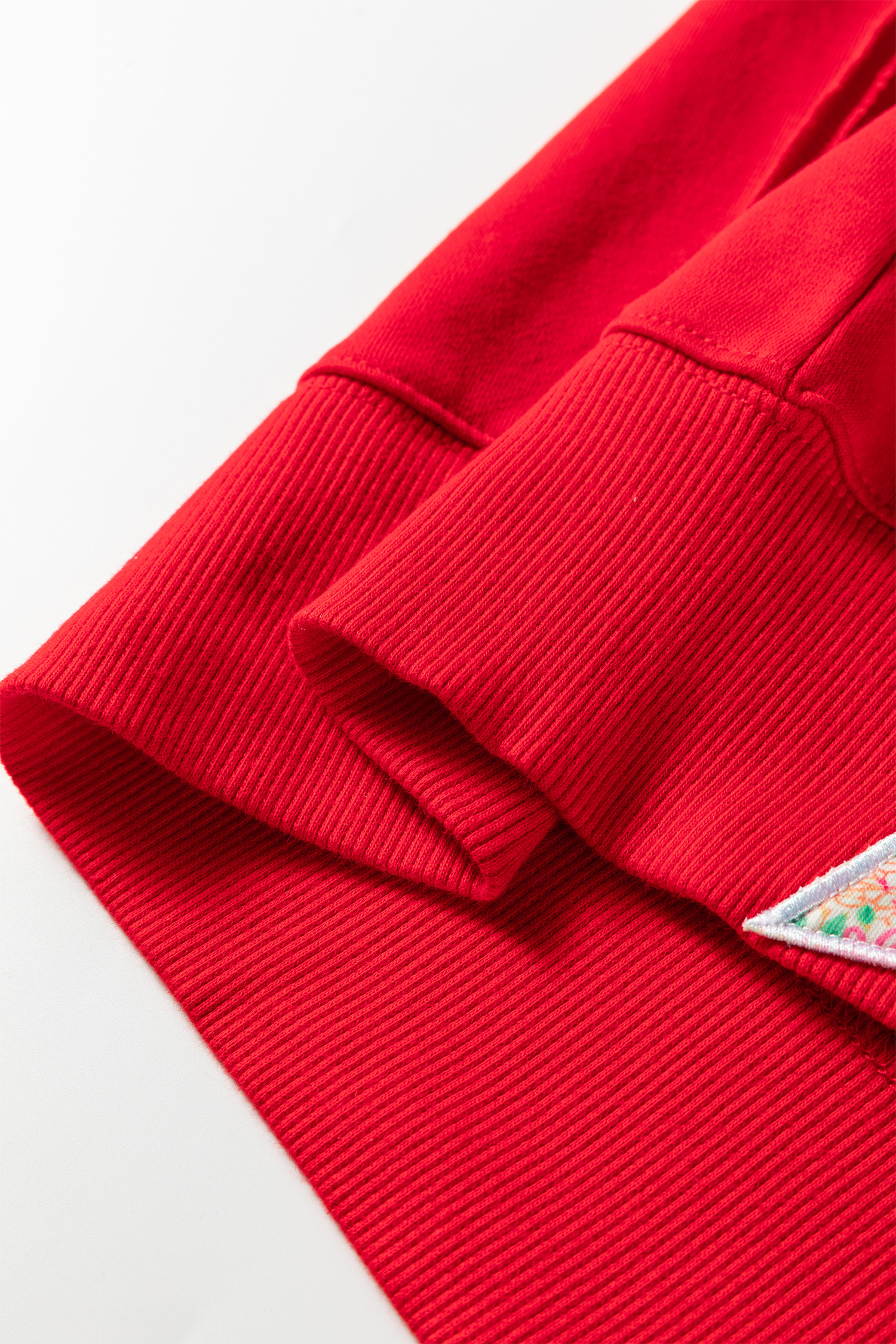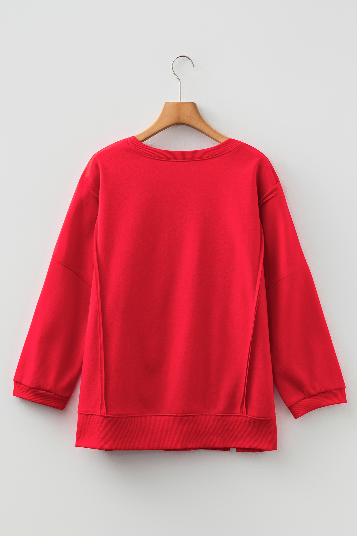 Feurig rotes Sweatshirt mit Blumenmuster, Schleifenapplikationen, sichtbaren Nähten, Schlitzen und lockerem Schnitt