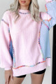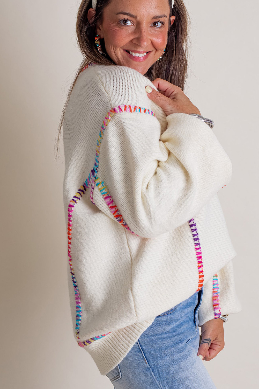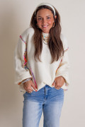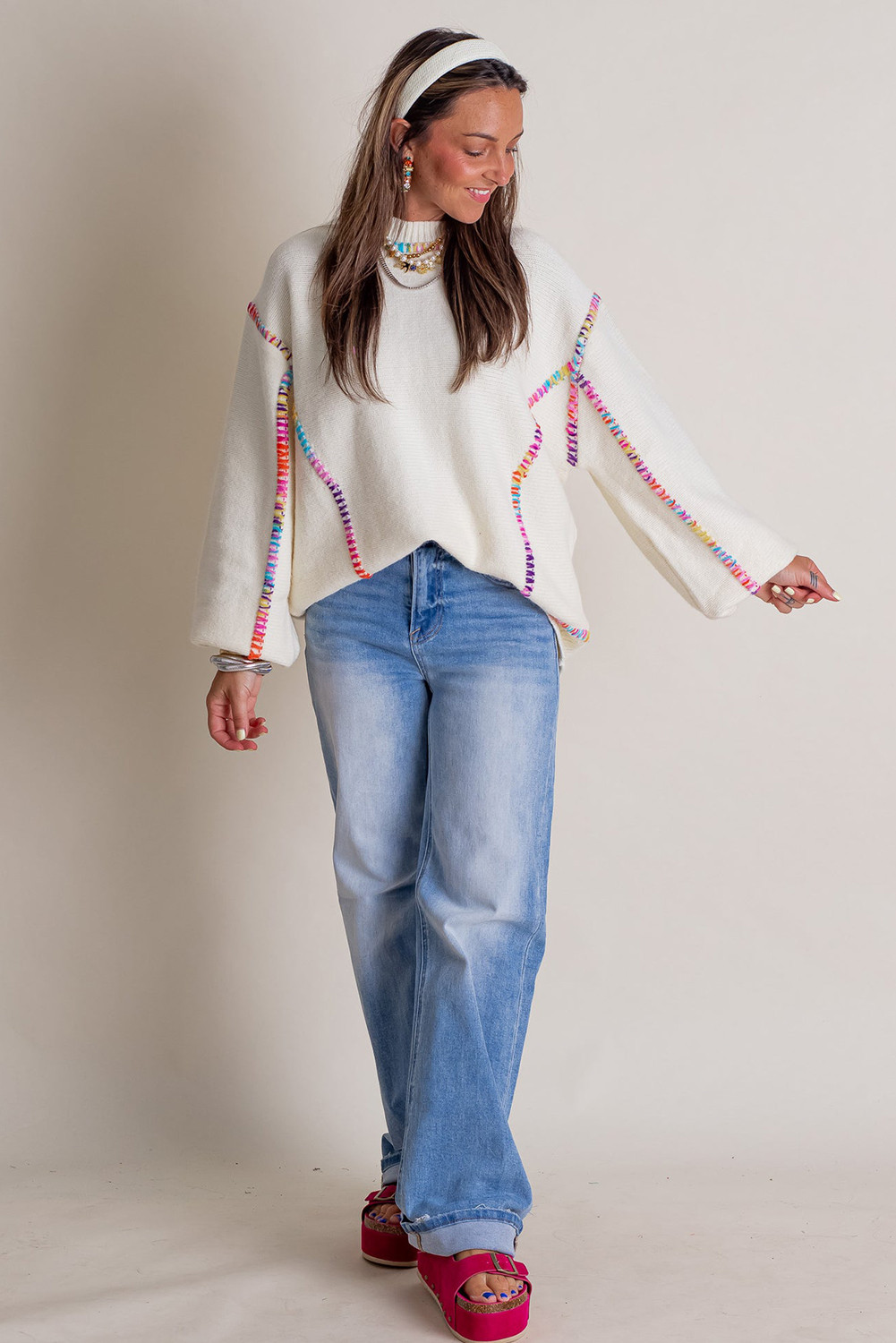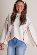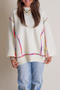 Weißer Pullover mit Regenbogen-Stickerei und Ballonärmeln, locker geschnitten